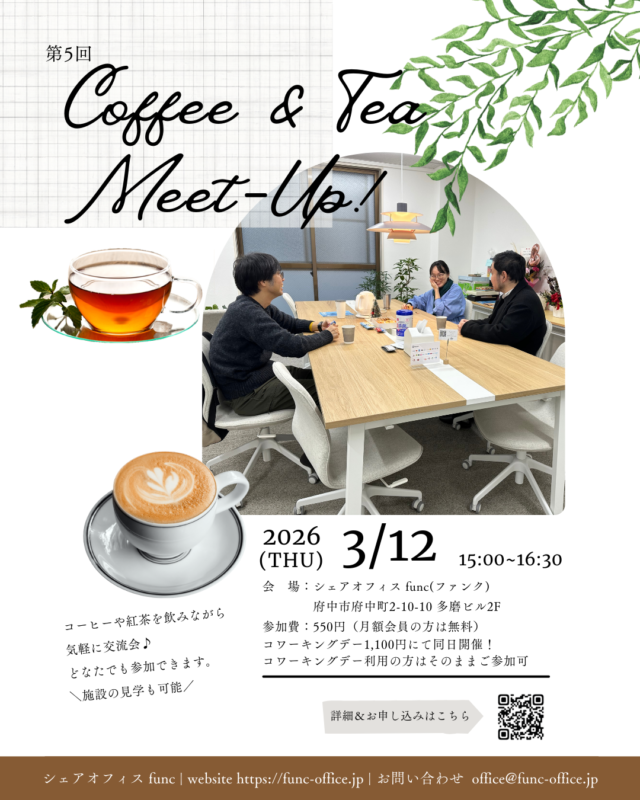 | ※当日はコワーキングデー開催日!10:00~18:00、日額1,100円でコワーキングエリアをご利用いただけます。コワーキングデーご利用の方は追加費用なしで、Coffee Meet-Up!にご参加いただけます。 | |