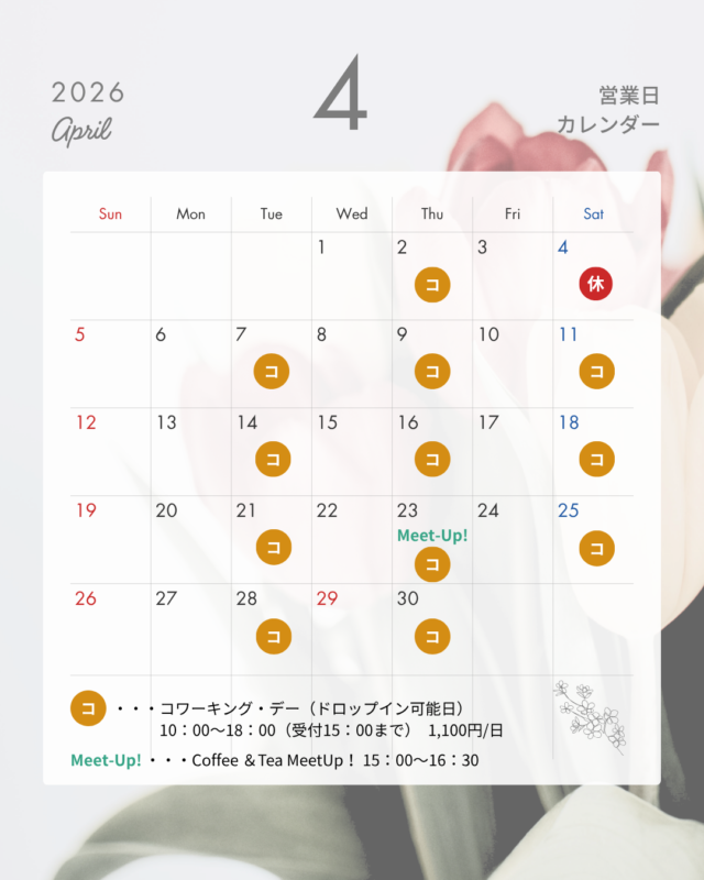 ※コワーキング・デー利用の方は、Coffee & Tea Meet-Up!の参加申し込みは不要で参加いただけます。