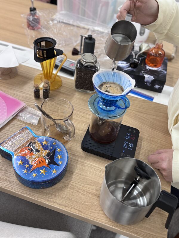 そしていよいよ、コーヒーのテイスティングタイム。今回は、同じ豆で煎り方を変えるとどんな変化があるのか、浅煎りと深煎り、それぞれ焙煎したての豆をご用意くださいました。まず驚いたのは香りの違い。同じ豆の余韻はあるものの、浅煎りは華やかに広がるフルーティな香り、深煎りは香ばしく濃厚な香り。その場でそれぞれの豆を同じ条件で淹れてくださり、飲んでみると、まるで違う豆のように感じられ、焙煎の力と豆の個性の奥深さを体感しました。